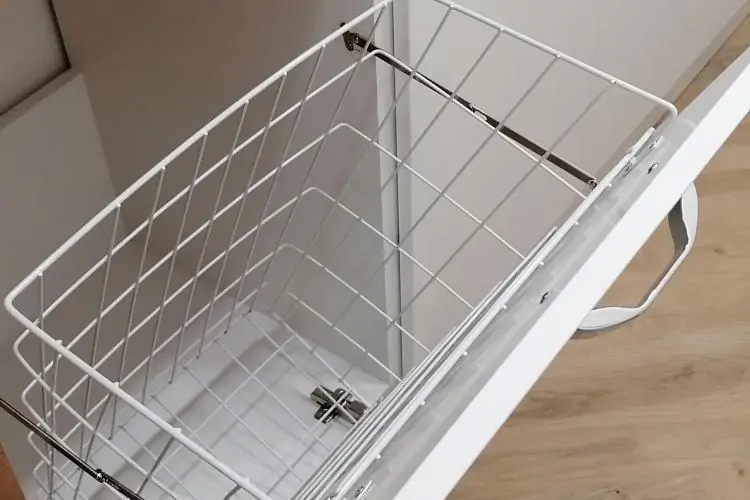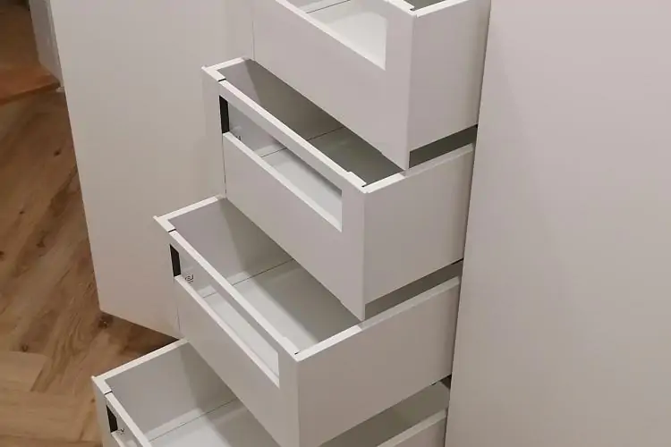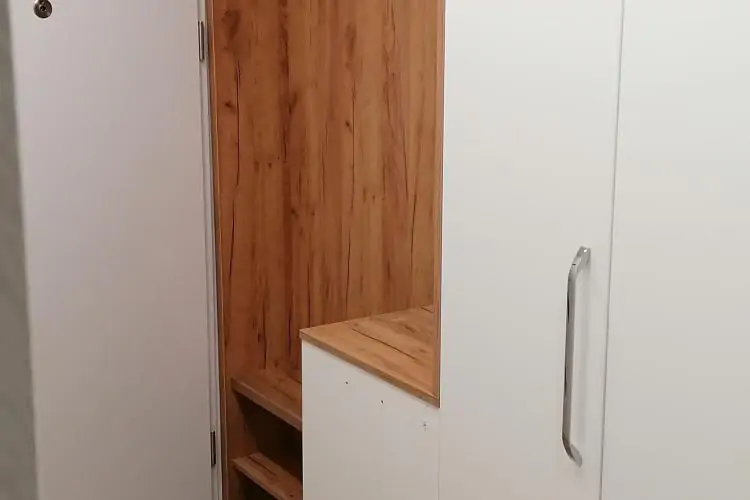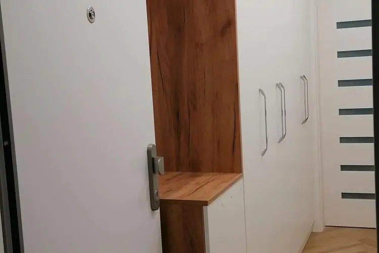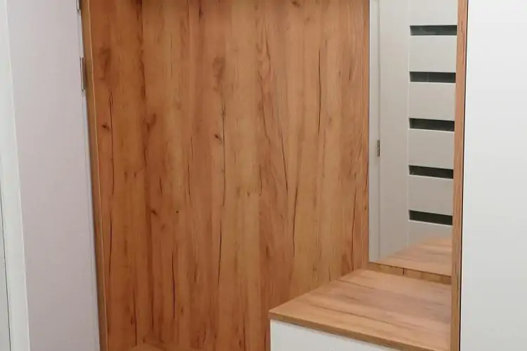 Předsíňová stěna - bílé lamino a K003 Gold Craft Oak, úchytky Neiva, horní dvířka bezúchytkové Tip-on.